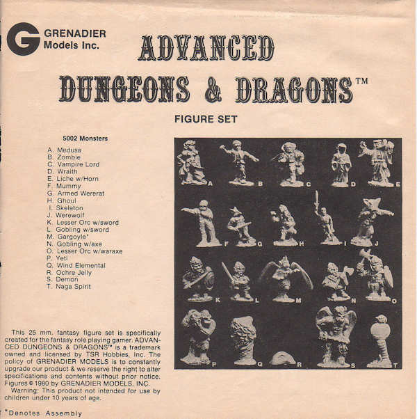 Grenadier released five large boxed sets three of which came with many useful monsters and two of which came with all to many human types. At the time, getting a box of 20 varied player character was a nice thing. To a collector years later, who is swamped with player characters and short on interesting monsters, more large monster boxes would have been nice... Four of the large box sets (all but the dragon) were carryovers from their Wizzards & Warriors line.